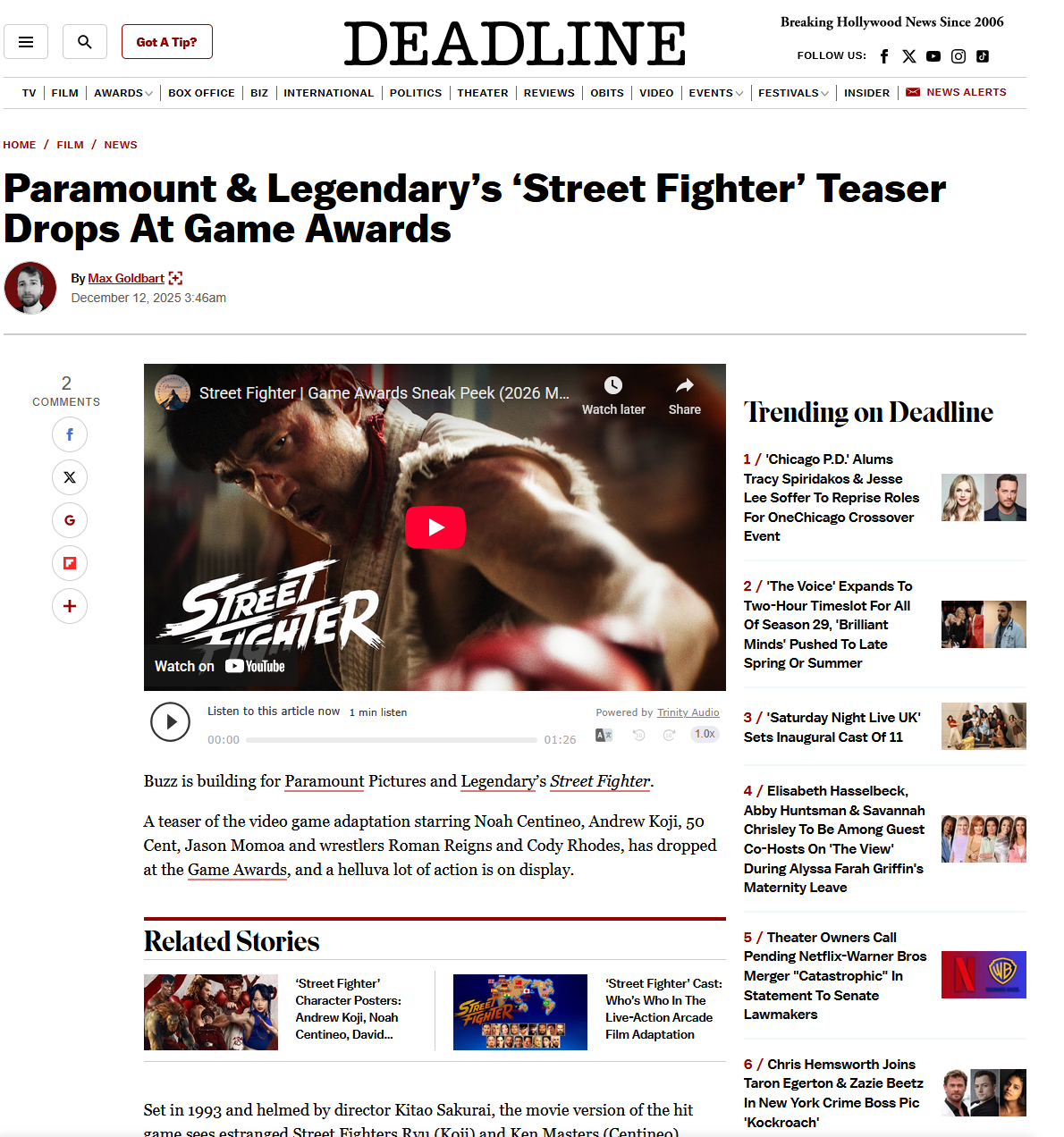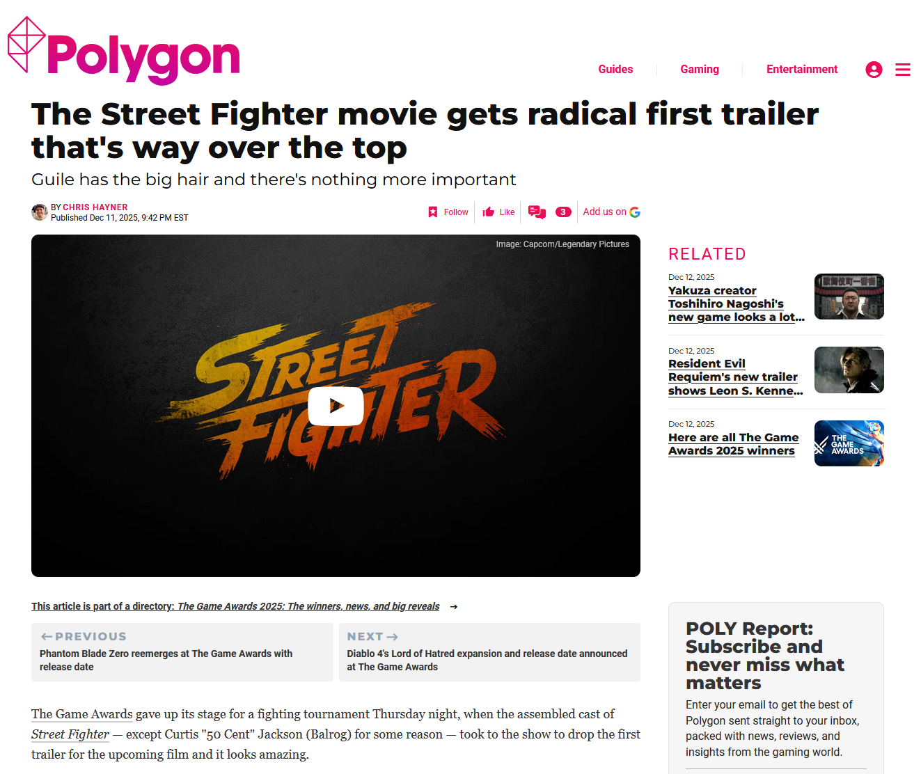I was hired by Concept Arts in Los Angeles, CA to help their client, Legendary Pictures, lead the social media charge for the unveiling of the cast and trailer for the new Street Fighter 2026 movie. This project was a sprint, being briefed and needing hundreds of copy assets and deliverables due within 24hrs of the briefing. In this project I helped develop Street Fighterās tone-of-voice on social media while working alongside designers and being in constant contact with the client to ensure on time approvals for The Game Awards event. This project also needed extensive social listening and live copywriting during the event.